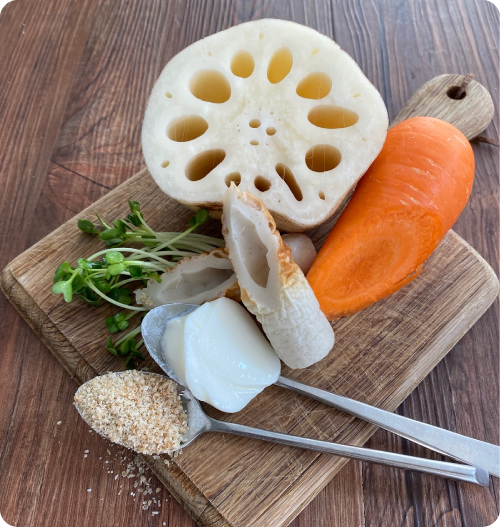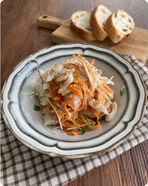 蓮根のシャキシャキ感、人参の歯応えで、しっかり噛んで食べられるサラダです。秋が旬の新蓮根はみずみずしく低カロリーで満腹感を得られやすいお野菜です。βカロテンが豊富なにんじんと組み合わせることで、さらに免疫力の向上や風邪予防、美容効果も期待できます。コラーゲン生成を促進する働きがあるビタミンCや、コレステロールの排出を助け、腸内環境を整えて便秘解消や消化器官の健康促進が期待できる食物繊維も豊富。むくみの解消や高血圧リスクを減らすカリウムも。低GI値で血糖値の急激な上昇を防ぎます。 ちくわは低カロリーで高タンパク・低脂質でバランスの良い食材です。 DHA/EPA含み、旨みもあるのでちょこっと足しの食材としても便利です。 胡麻のゴマリグナンには女性ホルモンに似た作用があり、セサミンは血糖値を緩やかにし、糖や脂質の代謝を助ける作用があります。ヨーグルトと合わせることで整腸のサポートも。 |
