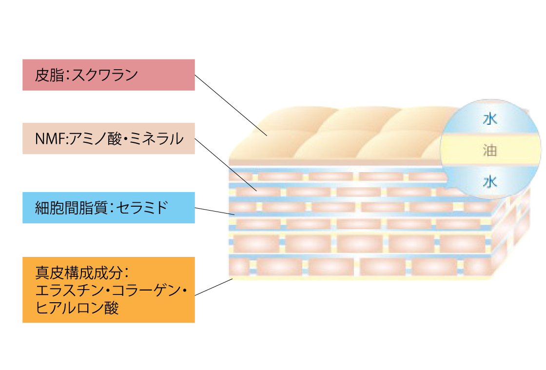 コンシダーマルブランドのコンセプトは「肌成分」×「肌構造」。実はオールインワンという形が“理に叶っている”ことをご存知ですか? 今回は「肌成分」について解説します。 コンシダーマルスキンライズローションプラスの箱に表記されている【成分表】。ほとんどが“肌に関わる成分”をもとに構成されています。 私たちの肌は以下のような成分でできています。 |