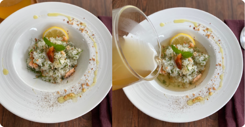 材料(2人分) ごはん … 200g ディル … 5茎(お好みで) ミントの葉 … 8枚(お好みで) サーモン切り身 … 1枚 オリーブオイル … 大1 レモン汁 … 少々 塩・胡椒 … 少々 [スープ用] コンソメ … 1個 水 … 300ml |